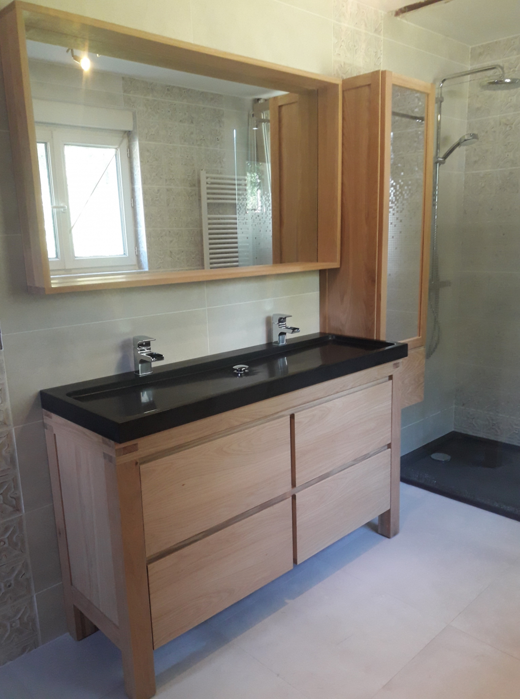 Rénovation salle de bain, receveur Jacob Delafon, paroi fixe Ronal ,meuble vasque Pierre et WC suspendu Geberit autoportant.